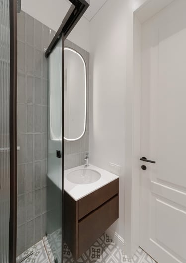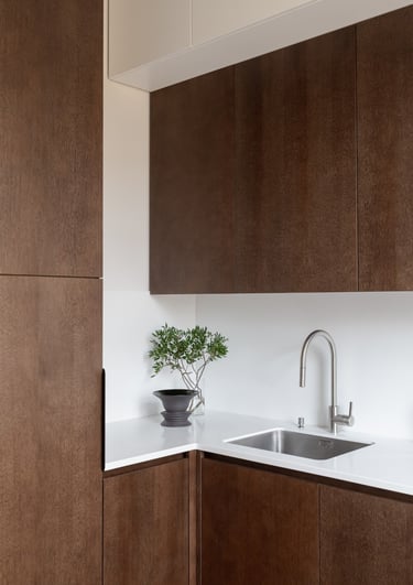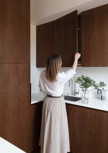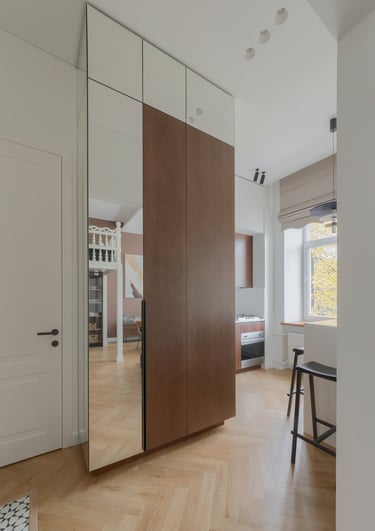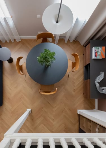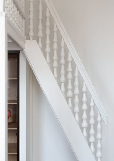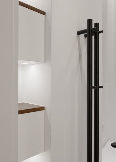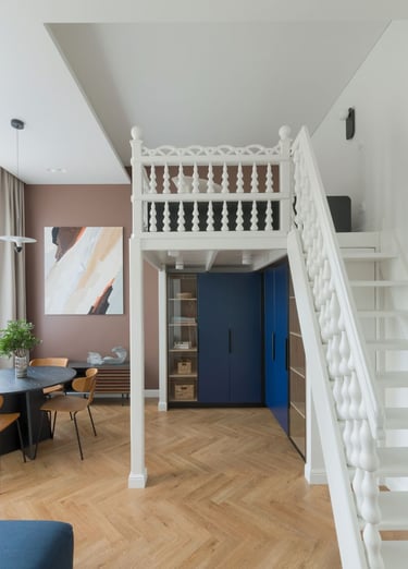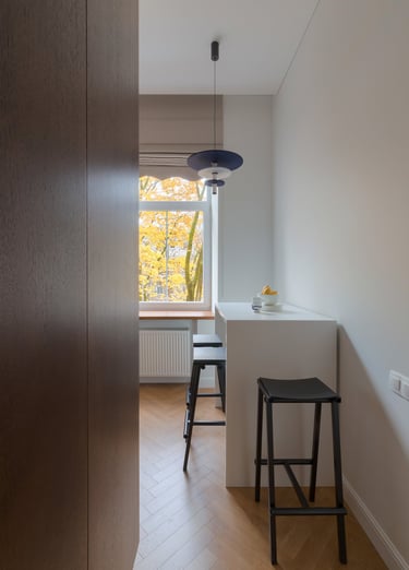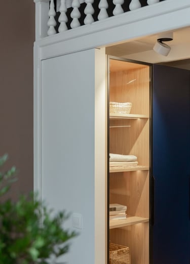 Unikaliausia šio buto detalė - antresolė ir laiptų turėklai, kuriuos dar prieš daug metų iš medžio masyvo ištekino ir sumontavo užsakovės vyras. Nors iki būsto atnaujinimo dalis detalių atrodė kiek senoviškai ir buvo kilę minčių jų atsisakyti, antresolę nusprendėme išsaugoti ir perdažyti baltai. Po ja suformavome spintą, taip praplečiant svetainės erdvę ir kartu sukuriant pakankamai vietos daiktų laikymui.